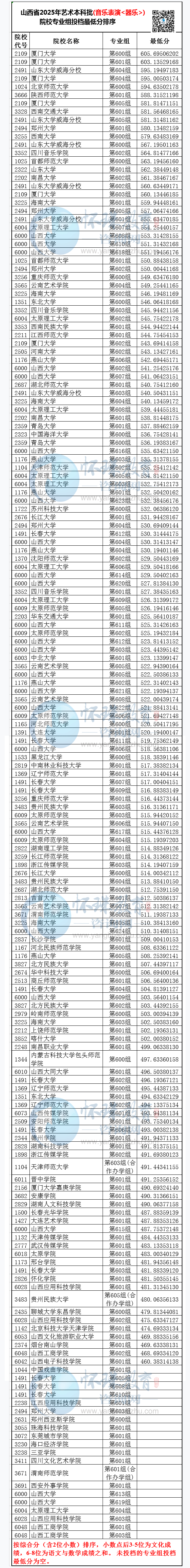 山西省2025年艺术本科批(音乐表演<器乐>)院校专业组投档最低分