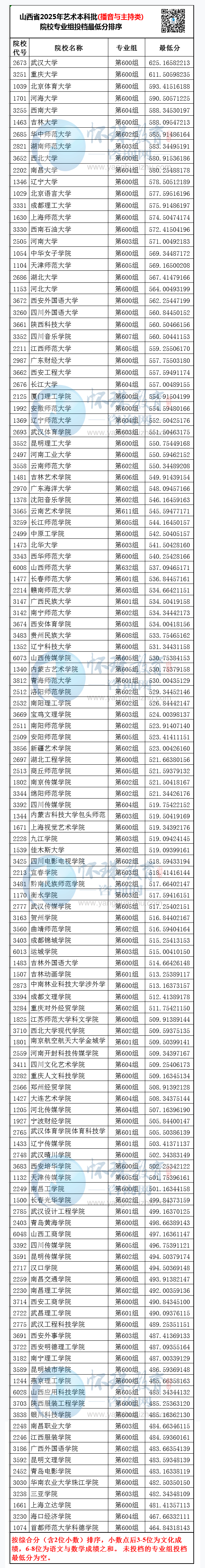 山西省2025年艺术本科批(播音与主持类)院校专业组投档最低分