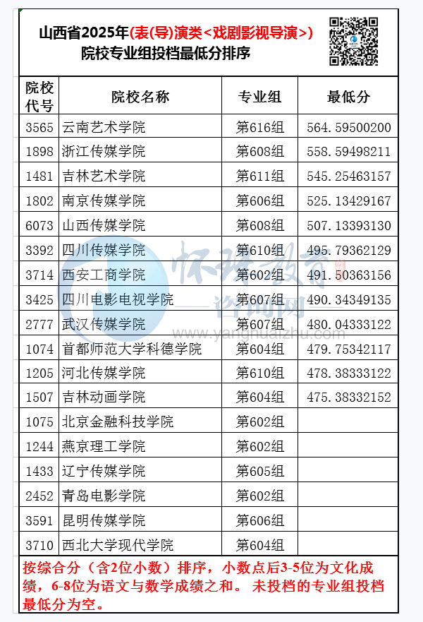 山西省2025年艺术本科批(表(导)演类<戏剧影视导演>)院校专业组投档最低分