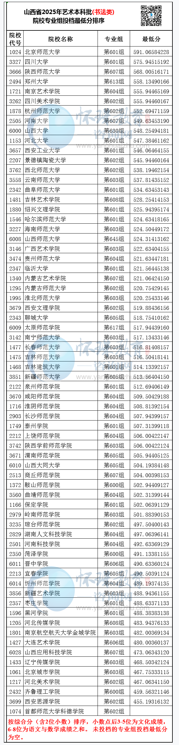 山西省2025年艺术本科批(书法类)院校专业组投档最低分