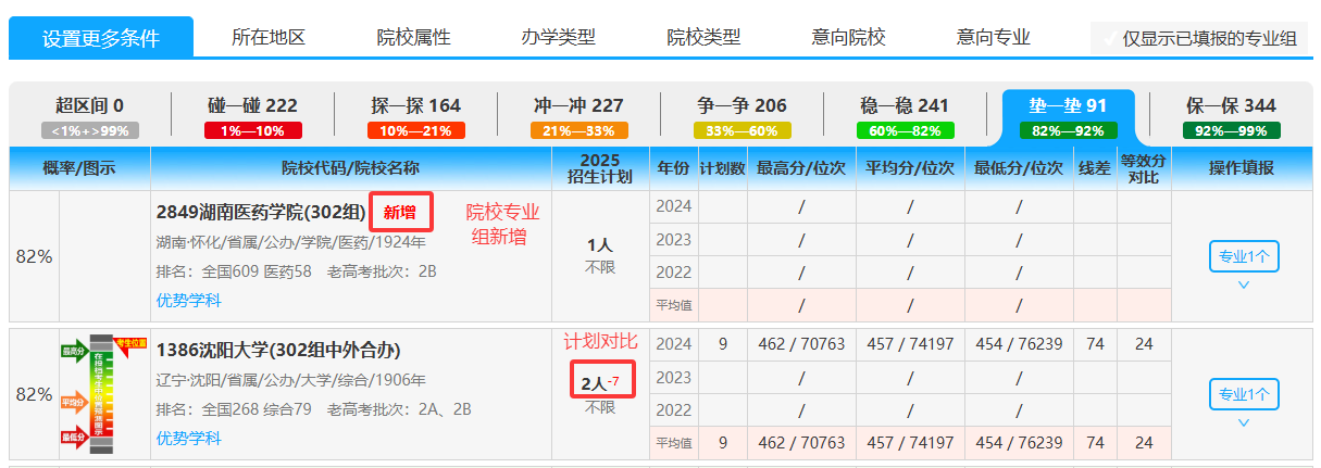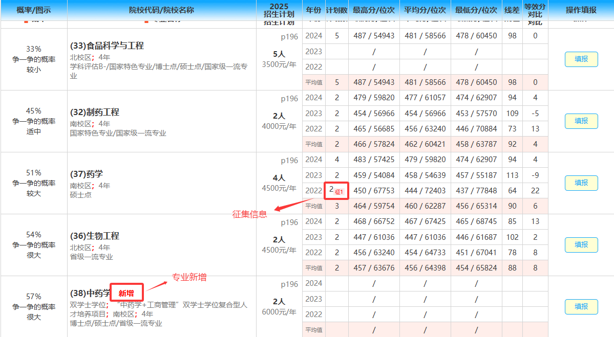 ⑥标注新增院校专业组或专业、计划对比、专业征集缺档信息等。