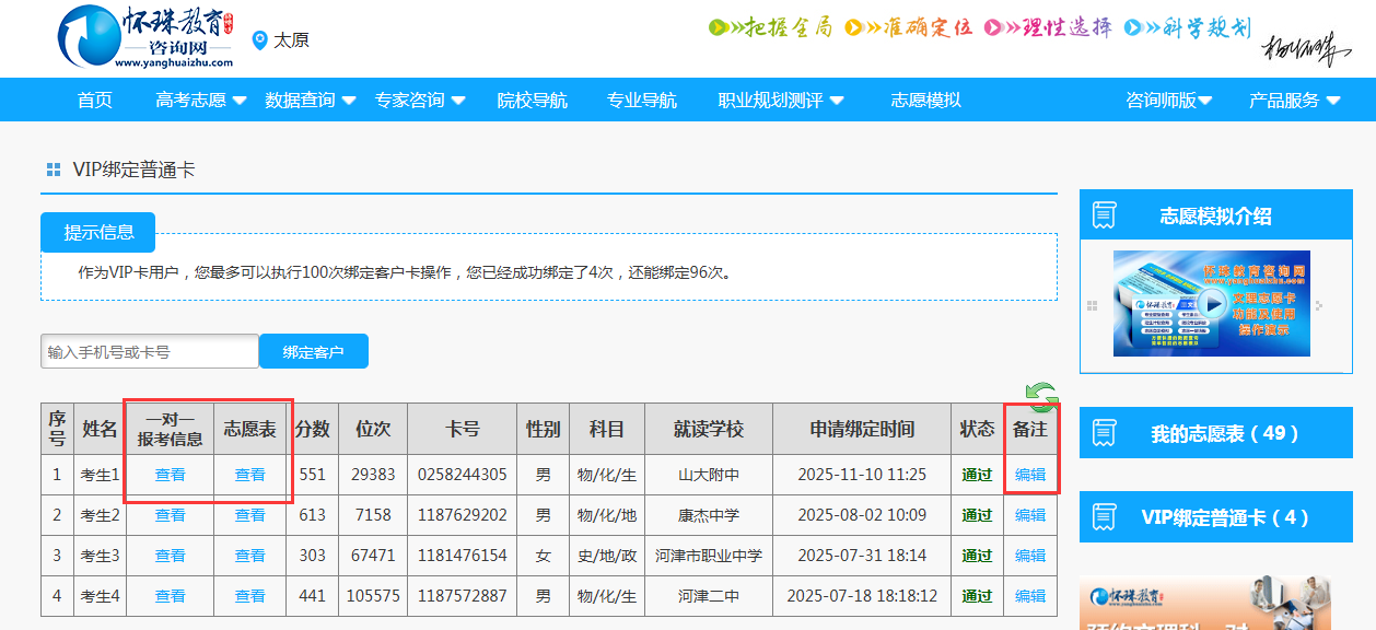 ②VIP卡可以同步看到绑定用户所提交的一对一报考信息(可下载到本地)以及志愿方案,还可以进行备注。