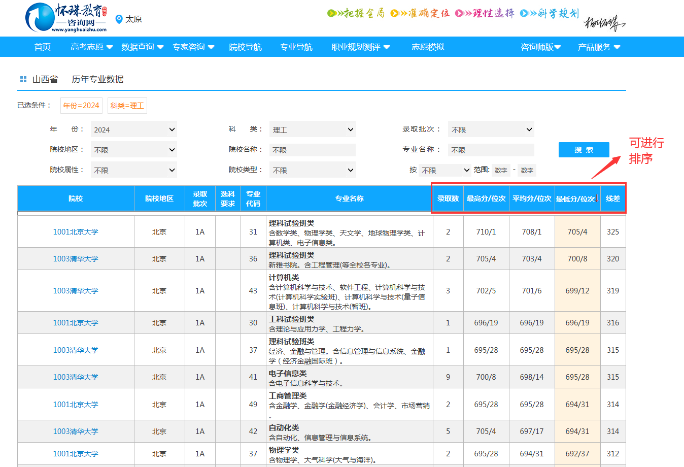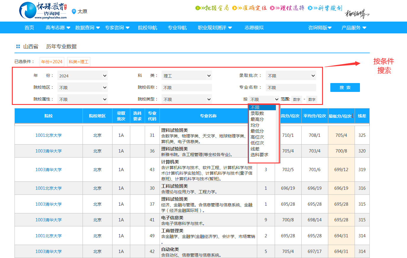 3.以数据库形式查看往年专业数据:可按院校地区、院校名称、专业名称、院校属性、院校类型、选科要求等条件进行筛选查找,数据可进行排序显示。