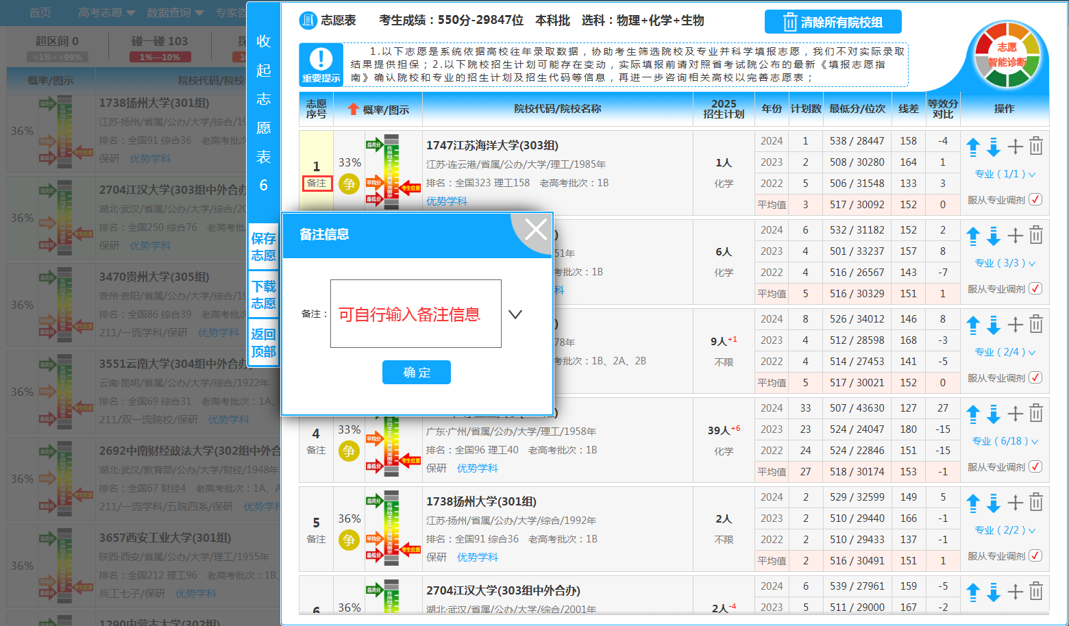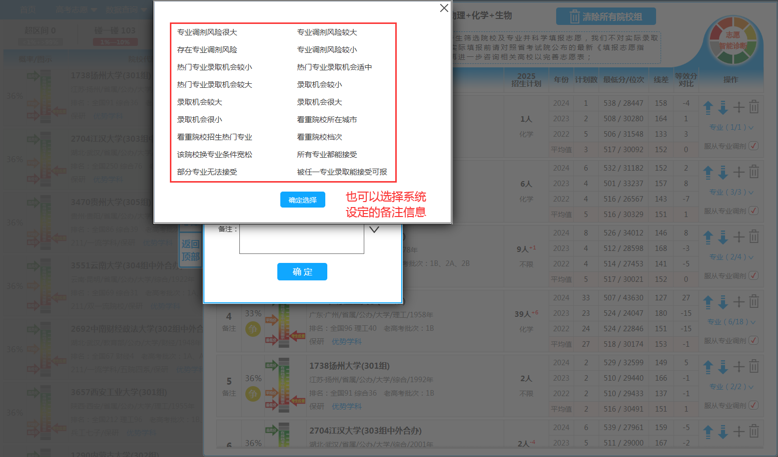 ③可以对已选定的院校专业组或某个专业进行备注说明。
