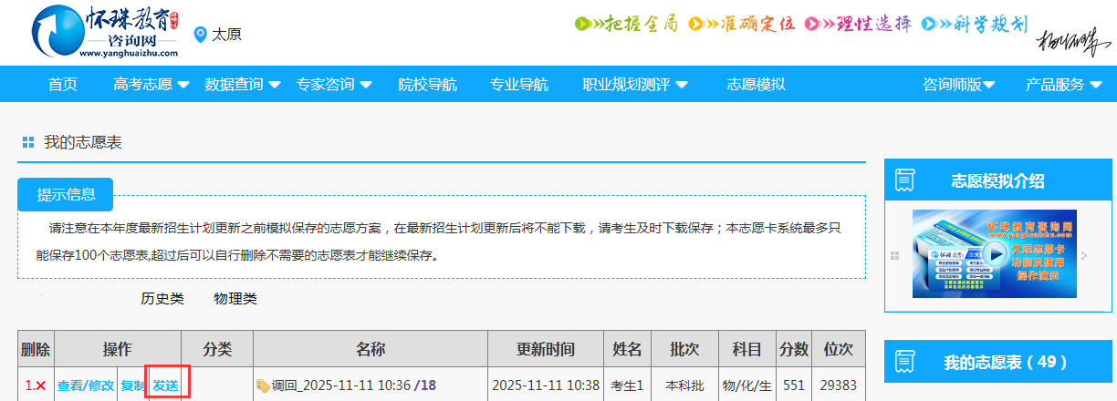 ④可以通过志愿模拟自行做好方案后,发送给已绑定的普通卡用户。
